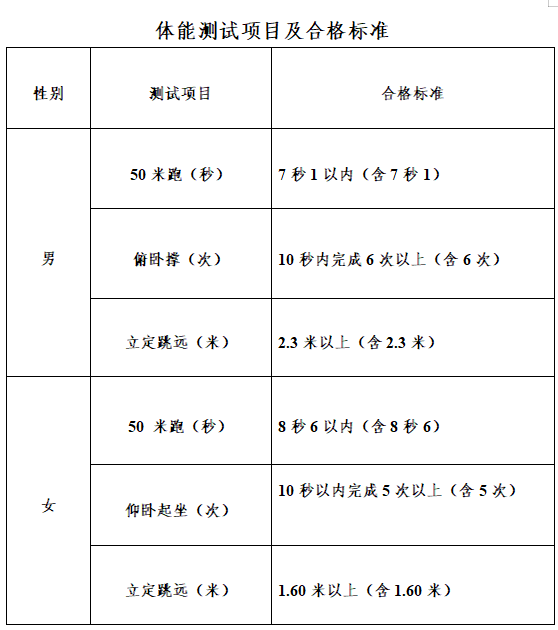 4.体能测试成绩合格(三项测试中可以选择二项进行测试,二项及二项以上合格者视为合格)。